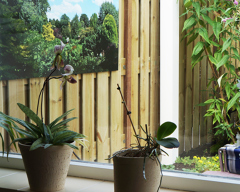 Forexplaat 128x72 cm hangt op de schutting en is van binnenuit gefotografeerd. Past prima in de omgeving.