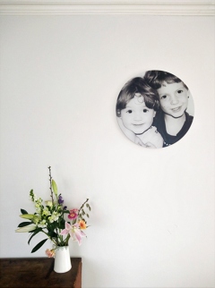 Fotocollage 60x60, 81 gezinsfoto's van 18 jaar opgroeiende kinderen. Zeer mooi afgedrukt op de forexplaat!