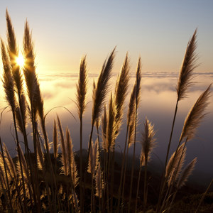 Coucher de soleil sur champ d'aigrettes de pissenlits